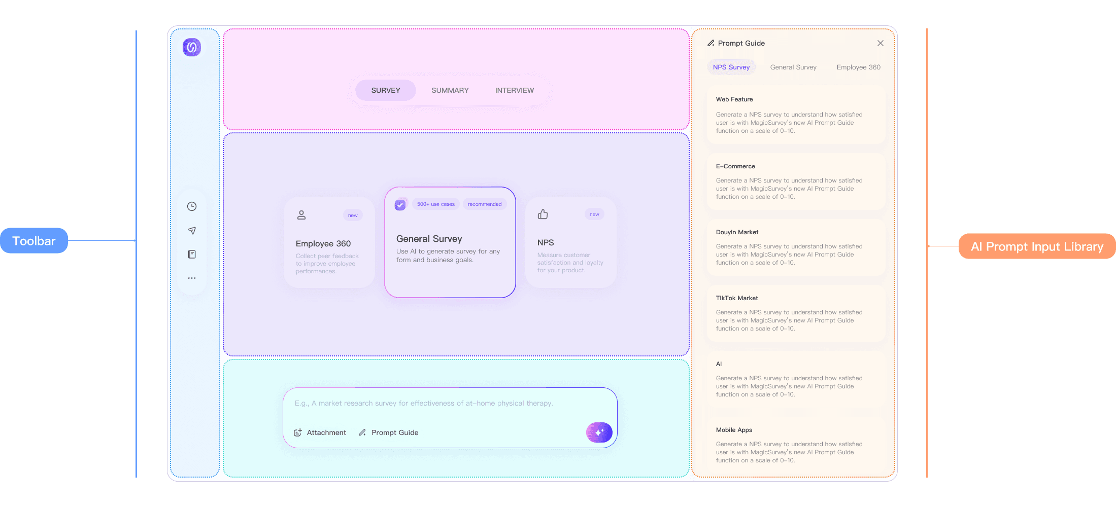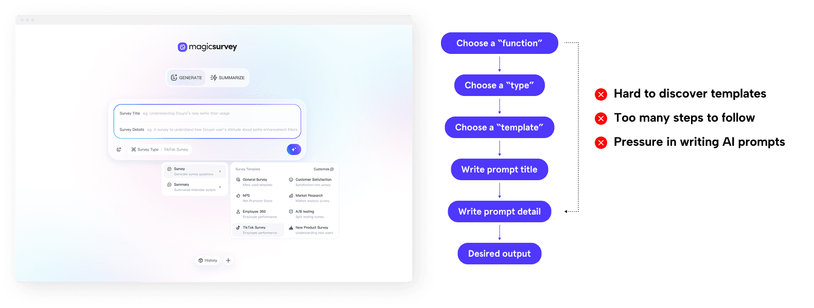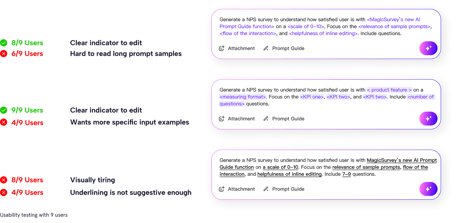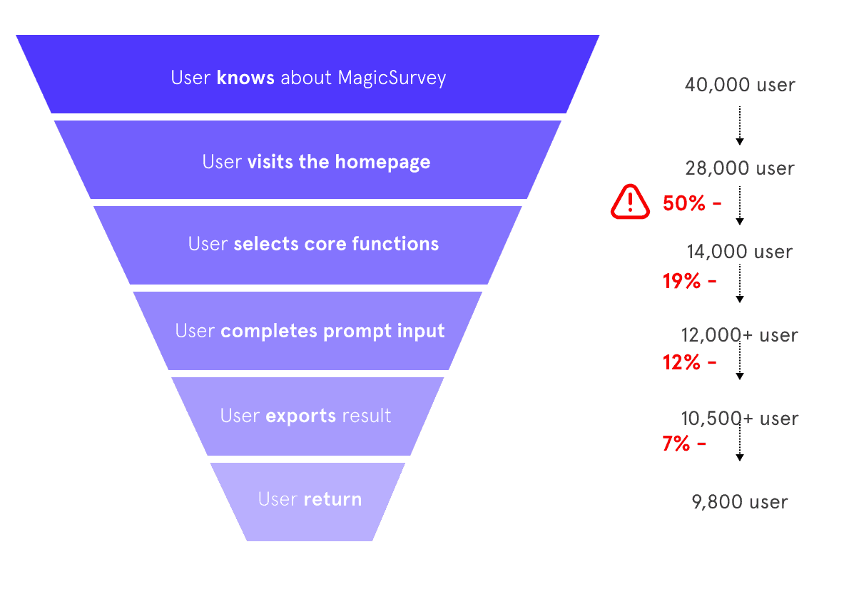 MagicSurvey's H1 2023 data shows that more than 50% of the users dropped off after or during the prompt input step, with low task completion rate.